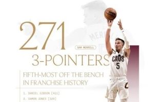 体育资讯11月8日讯 骑士官方发布纪录,梅里尔以替补身份命中率271记三分,超越科沃尔排名骑士队史第五。