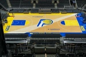 体育资讯11月15日讯 步行者官方晒出了球队新赛季城市版的球场地板涂装。