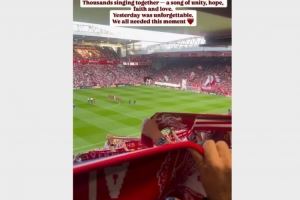 在她的帖子中,娜塔莉亚写道:“YNWA(你永远不会独行)是特别的。永远如此。这是一句宣言。成千上万的人一起唱这首歌,一首关于团结、希望、信念和爱的歌。昨天是难忘的一天,我们都需要这一刻。”
