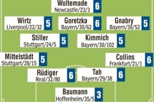 首发:沃尔特马德6分、维尔茨5分、格雷茨卡6分、格纳布里5分、斯蒂勒5分、基米希5分、米特尔施塔特5分、吕迪格6分、若纳坦-塔6分、纳姆迪-科林斯6分、鲍曼3分