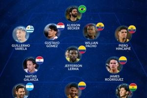 后卫:瓦雷拉(乌拉圭)、古斯塔沃-戈麦斯(巴拉圭)、帕乔(厄瓜多尔)、因卡皮耶(厄瓜多尔)