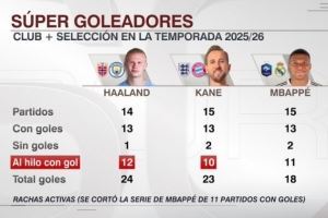 体育资讯10月23日讯 ESPN统计了哈兰德、凯恩、姆巴佩本赛季俱乐部+国家队的数据,并做出对比。